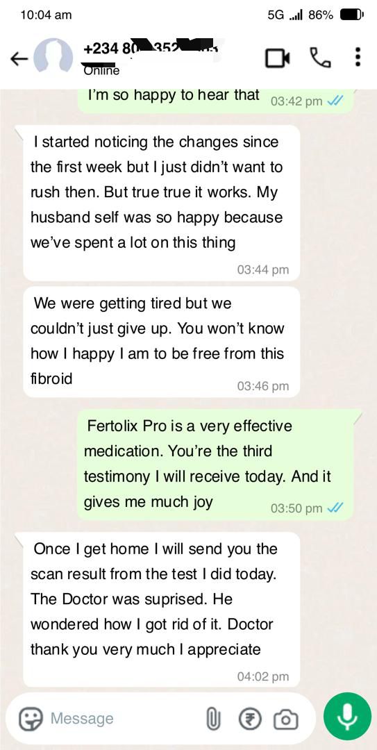 "I've tried so many products before but nothing worked. Fertolix Pro is different. My fibroid went from 55cm to completely gone in just 5 weeks. The bloating stopped, my energy came back, and I feel like myself again!"