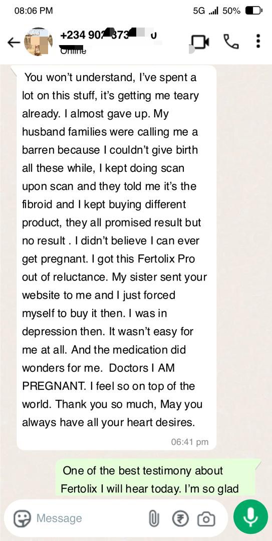 "After 5 years of trying to conceive, I was losing hope. My doctor confirmed blocked fallopian tubes. Fertolix Pro cleared my tubes in just one month! I conceived naturally and now have a beautiful baby girl. Forever grateful!"
